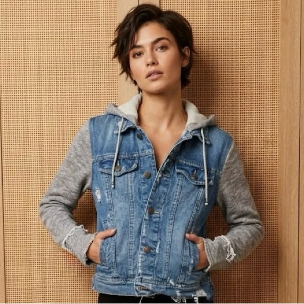 Free People Blue Denim Jacket with Gray Hoodie Sleeves