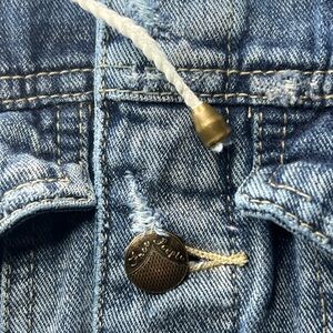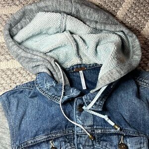 Chic denim jacket by Free People. Features gray knit accents. Ideal for layering.