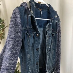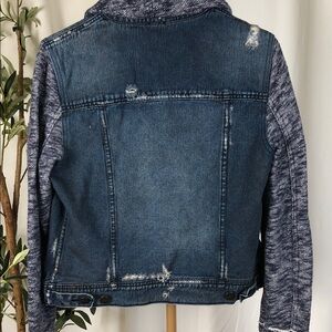 Chic denim jacket with cozy knit sleeves. Ideal for layering. Removable hood. Distressed look mixed media jean jacket. Comfortable and stylish
