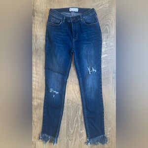 Stylish blue distressed denim jeans by Free People. Classic button and zip closure. Perfect for casual wear.