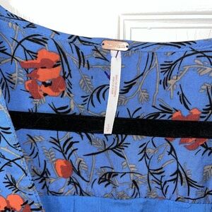 Chic Maeve dress featuring a striking floral pattern. Blue base with red flowers.