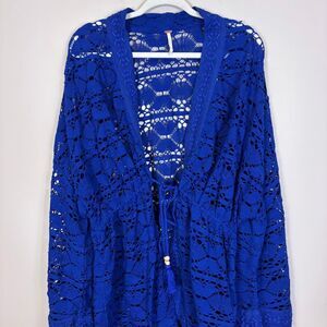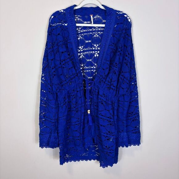 Excellent condition Free People Blue Eyelet Lace Bell Sleeve One Size Kimono Dark Rinse