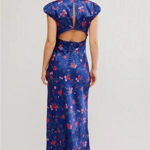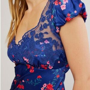 Elegant blue dress with vibrant floral pattern. Features short sleeves and a flattering fit. Maxi length. Lace detail on chest and along the bottom.