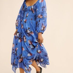 Free People Women's Size Small Blue Floral Morning Glory Smocked Maxi Dress, Shell - 100% Cotton, Lined - 100% Rayon, No Stretch, Pullover Style, No Pockets, Handkerchief Hemline, Semi Sheer Balloon Sleeves, Style # OB2003304