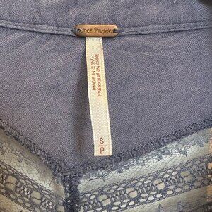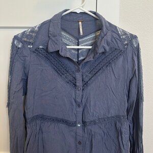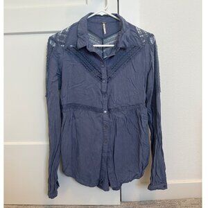 Free People Blue Grey Lace Panel Collared Blouse Size Small