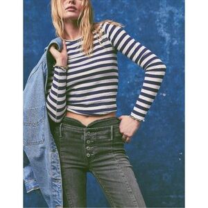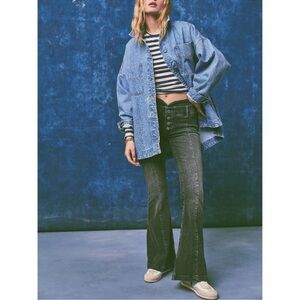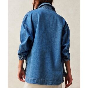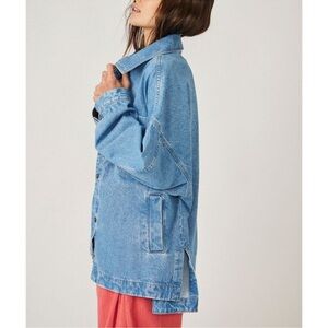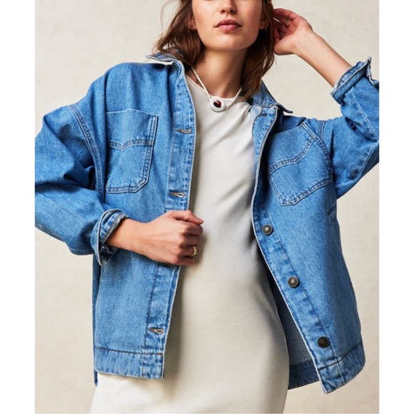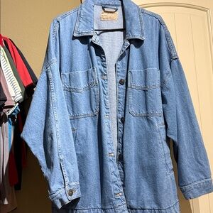 Stylish blue jean jacket. Classic design with button closure. Perfect for layering.