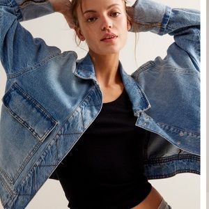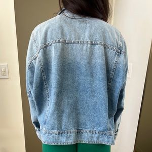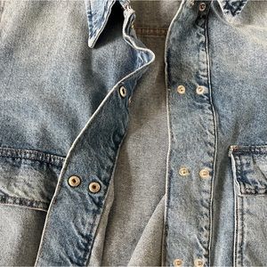Stylish denim jacket. Features large front pockets. Button-up closure. Classic collar design.