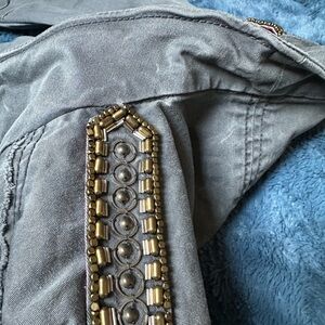 Chic blue jean jacket with decorative buttons. Features embellished shoulders for a stylish look.