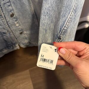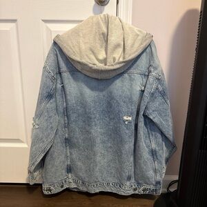 Stylish jean jacket with a cozy gray hood. Features distressed details and front pockets. Perfect for casual wear. Never worn, new with tags. Size medium. Oversized fit.