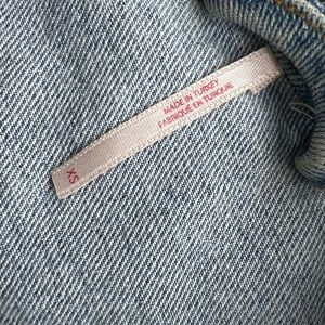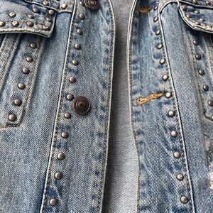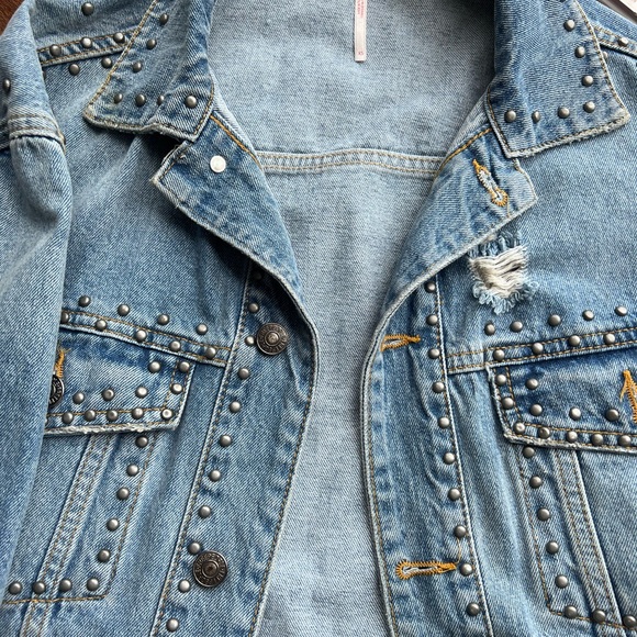 Stylish blue jean jacket. Features studded embellishments. Distressed accents for a trendy look. Perfect for casual wear.