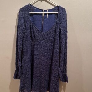 This elegant blue lace dress is perfect for any occasion. Its intricate lace design adds a touch of sophistication. Ideal for evening events or a night out. great condition, drape sleeves, empire waist