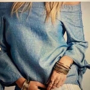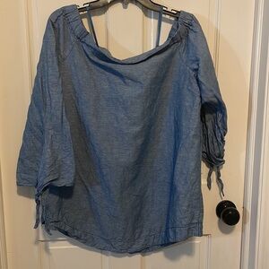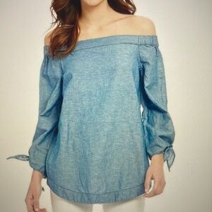 Chic off-shoulder blouse. Soft blue fabric. Tie details on sleeves.