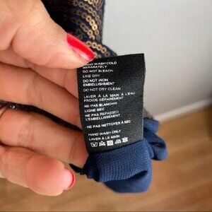Mesmerizing metallic swirling sequin design with contrasting navy color featured throughout