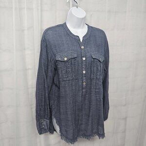 Free People Blue Plaid Blouse Peasant Boho Fringe Festival Grunge Hippie S