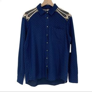 New with tag and extra buttons still attached. Details: Spread collar, long sleeves with double barrel cuff, front button closure, contrast pattern knit yoke, 1 front patch pocket, pattern through out, curved hem. See photos for details.