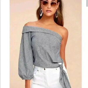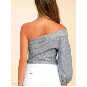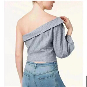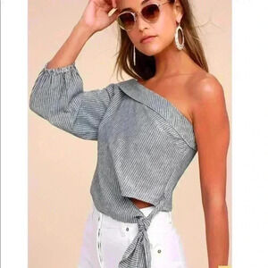 Dance like no one's watching in the Free People Get Down Blue Striped One Shoulder Crop Top! Blue and white striped woven fabric shapes a one shoulder neckline and long sleeve with elasticized cuff. Flirty cropped bodice with tying side cutout.