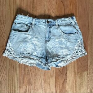 Denim shorts from Free People. These shorts feature cotton denim fabric, distressed styling, light blue and white acid wash, lace design accent on sides, 5 pockets.