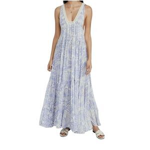 Free People Blue White Floral Tiers for You Maxi Dress Crochet Trim Boho Summer