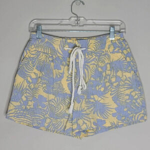Free People light blue and yellow Island print shorts. A tropical pattern provides a sunny update for these lightweight, weekend-ready shorts. Drawstring waist with two button/zip fly closure. Four pocket style. Palm leaf print.