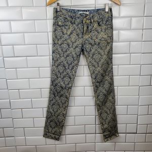 Chic skinny jeans with intricate blue and cream design. Elevate your casual style.