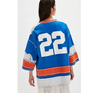 Vibrant blue top with orange accents. Features lace details and bold lettering. Perfect for casual wear.