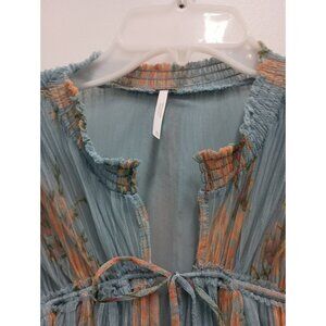 Flowy tunic with pleated design. Features tie details on sleeves and neckline. Perfect for a boho look.