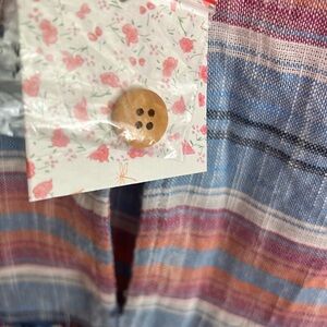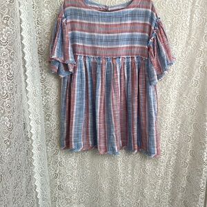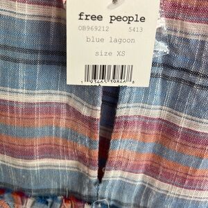 This relaxed blouse from Free People showcases a charming blend of blue and pink hues, featuring a boxy silhouette with short sleeves and ruffled details. Perfect for casual outings, it offers a comfortable and chic look with its soft fabric and stylish design.