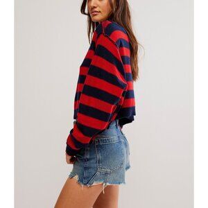 Embrace a relaxed and stylish look with the Free People sweater, featuring bold horizontal stripes in vibrant blue and red. This crew neck sweater offers a casual fit with long, slightly puffy sleeves and a cropped length that hits at the waist. Crafted from a medium-weight knit material, it provides both comfort and a striking visual appeal, perfect for any casual occasion.