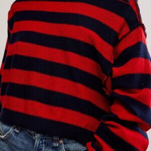 Free People Blue and Red Crew Neck Sweater with Bold Stripes