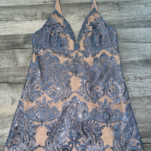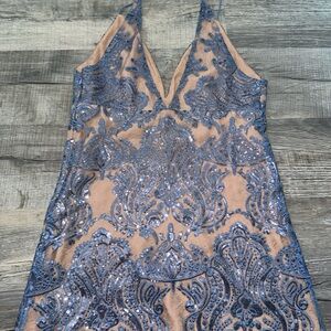 Elegant lace dress with intricate blue patterns. Features a deep V-neck and halter straps. Perfect for special occasions.