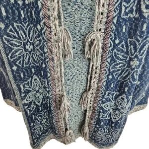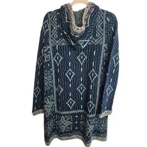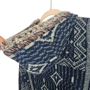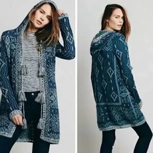 Stylish blue cardigan with intricate white patterns. Features a hood and open front design. Perfect for layering.
