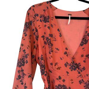 Free People Bohemian Coral Floral Faux Wrap Dress With Bell Sleeves Size L