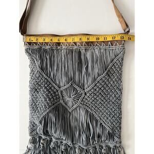 The Free People Bohemian Fringe Bag is a stylish and spacious handbag perfect for the hippie cowgirl aesthetic. Made from cow suede with silver metal accents, this large bag features a solid gray exterior with fringe detailing, giving it a unique and trendy look. The snap closure, crossbody strap handle style, and suede lining make it practical for travel, parties, or casual outings. With a blend of Western, hipster, and bohemian themes, this bag is sure to make a statement and add a touch of personality to any outfit.