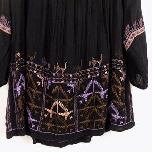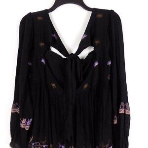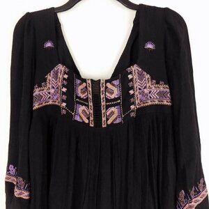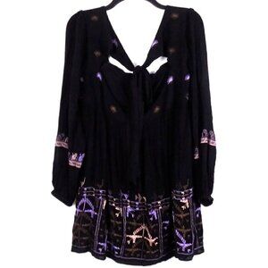 Free People Boho Black Mini Tunic Dress Size XS Rhiannon Embroidery Long Sleeve