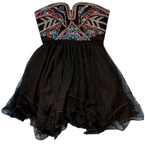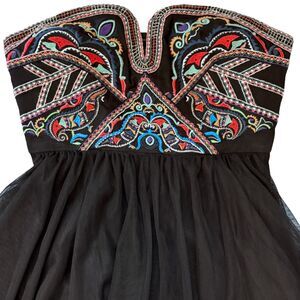 Stunning and one-of-a-kind Free People dress featuring a multicolored embroidered strapless bodice with a secure silicone grip. Designed with a layered tulle skirt adorned with sparkling details and finished with a hidden side zipper.