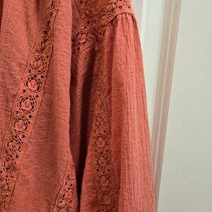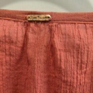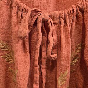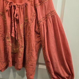 Boho Chic Embroidered Blouse By Free People in a luscious watermelon color is a one size fits all. This loose peasant blouse has fill sleeves with elastic at the cuff. It can be worn off the shoulder or tied as shown, giving options to how it is worn. Made in Vietnam it is 99% cotton with elastic and is machine washable in cold water with like colors. Perfect for dressing up or down, this romantic style will go with many pieces in your existing wardrobe.