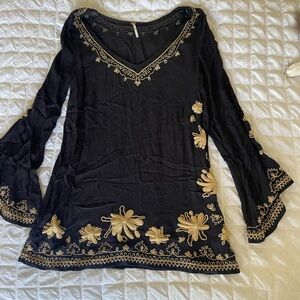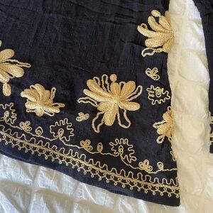 Elegant black dress with cream floral embroidery. V-neckline and long sleeves. Perfect for any occasion.