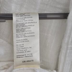 Features: Fringe hem, flared sleeves, lace insets, V-neckline, button front