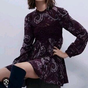 Free People Boho Hippie Lace Whimsigoth Paisley Sz XS Tunic Mini Dress Burgundy