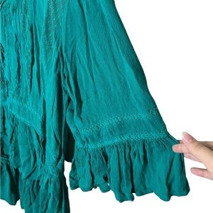 Free People Boho Lace Inset Embroidered High Low Hem Button Front Blouse in Teal, size medium. 100% rayon. Lightweight, flowy material. Long bell sleeves. High low hem. Lace inset, crochet, and embroidered details. Scoop neck neckline. Good preowned condition, no stains or flaws. Smoke free, pet friendly home. spring summer beachy resort vacation cruise breezy artsy unique hippie fairy renaissance faire ren fair fairycore