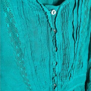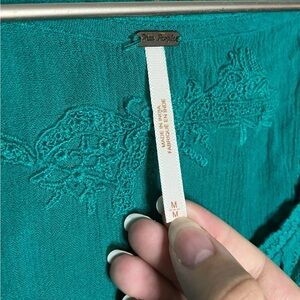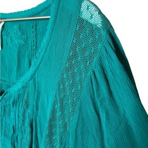 Free People Boho Lace Inset Embroidered High Low Button Front Blouse Teal M