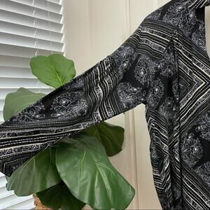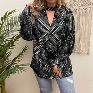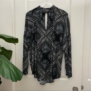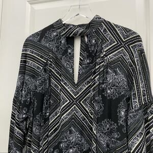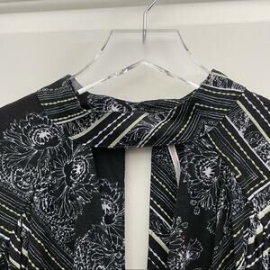 Black white and lime green floral boho print long sleeve tunic. Keyhole accent front and back. Slit by the wrist. Oversized.