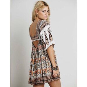 Free People Boho Paisley Floral Geometric Print Earthy Toned Babydoll Mini Dress