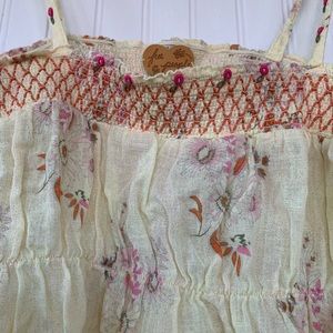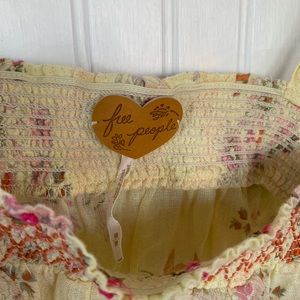 Free People Pale Yellow Floral Tie Strap Top. Slightly Sheer. Red embroidered stitching at neckline. Flowing fit.