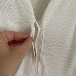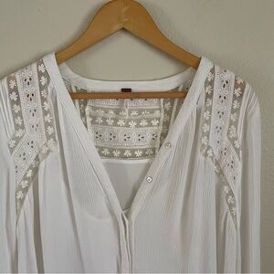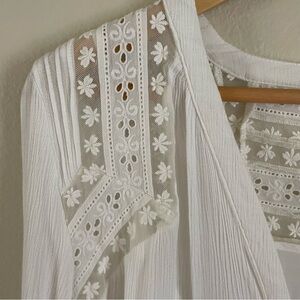 Features: tunic style, high low hem, oversized, long sleeves with button cuffs, v-neck, button front, includes detachable slip, side seam pockets, eyelet, lace, bohemian, swim coverup.