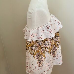 Strapless boho top by Free People. In excellent condition size large. Perfect for fall festivals! Super comfy & elastic at collar bone. Features a charming ruffle detail.