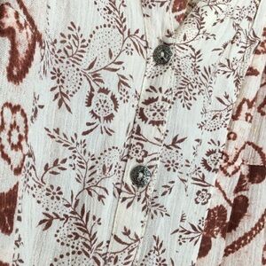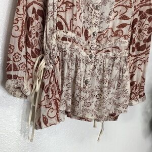 A gorgeous boho tunic top made by free people. A v-cut front with buttons down the front. Long sleeve with a button on the end. Ties on the sides and a string through the back to make it tighter or looser fitting. Found a hole under right armpit while measuring (included in pricing)