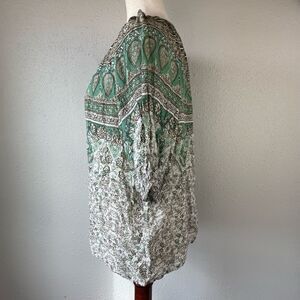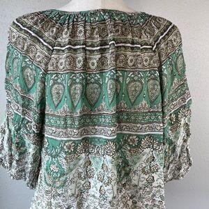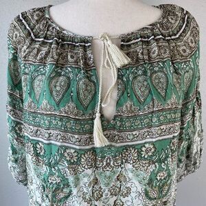 Beautiful BoHo style top by free people measuring 20 inches armpit to armpit laying flat and 24 inches in length from the shoulder to the hem.