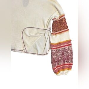 This cozy yet chic Free People top is perfect for layering or wearing solo. The bold, patterned balloon sleeves add a unique bohemian flair, making it a great choice for casual outings, festivals, or lounging in style. I would wear this with a denim vest!