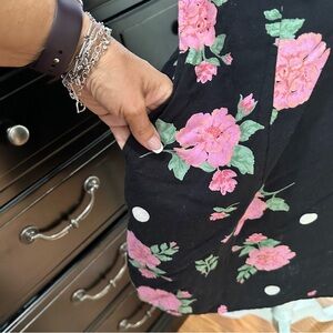 Bold, playful, and ultra-feminine — this is the Bom Bom Mini Dress by Free People. Designed in a vintage-inspired cotton blend, this flattering fit-and-flare features a ruched polka dot bust, puff sleeves, and vibrant pink florals scattered across a black backdrop.